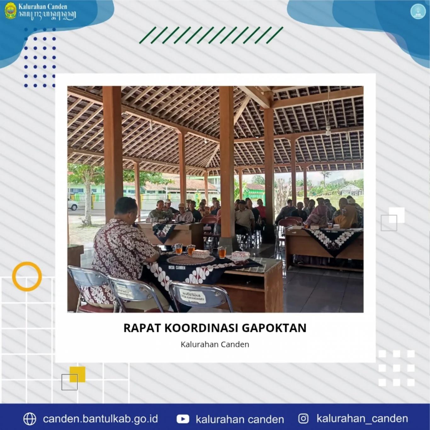 Kamis, 13 Februari 2025 Gapoktan Canden melaksanakan rapat koordinasi dengan kelompok tani Padukuhan dan Balai Penyuluh Pertanian Jetis. Koordinasi ini berkaitab dengan tindak lanjut harga beras yang menurun. Dari pertemuan ini dihasilkan bahwa Bulog akan membeli beras dari petani seharga Rp 6500/Kg. Selain itu, Pemerintah Kalurahan Canden juga akan melaksanakan pembagian bibit kepada Kelompok Tani.